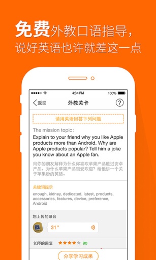 遠(yuǎn)在海外的真人口語外教免費為用戶進(jìn)行輔導(dǎo),針對語法、詞匯、發(fā)音進(jìn)行詳細(xì)知道,迅速提高學(xué)習(xí)效果,讓你英語更上一層樓。