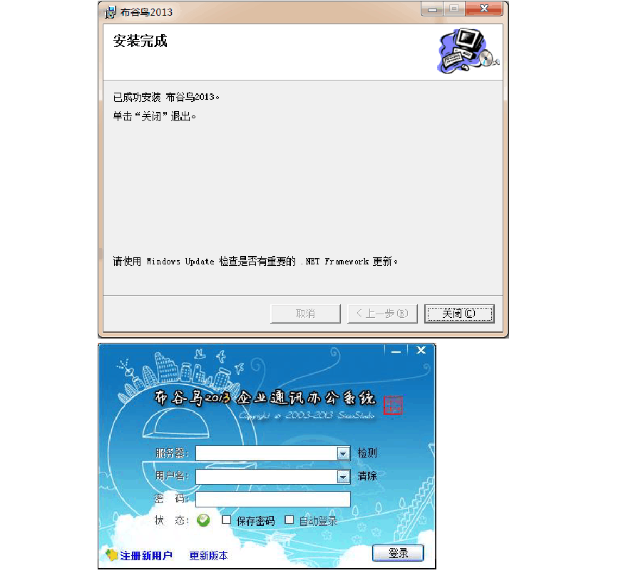 Server.msi和布谷鳥2013服務器端.exe是安裝程序。它們的區(qū)別是:前它只安裝布谷鳥運行的關鍵程序文件,而后者則會先考察一下操作系統(tǒng)的運行環(huán)境,當發(fā)現(xiàn)系統(tǒng)缺少.net2.0組件時會自動將.net2.0安裝,并安裝布谷鳥關鍵程序