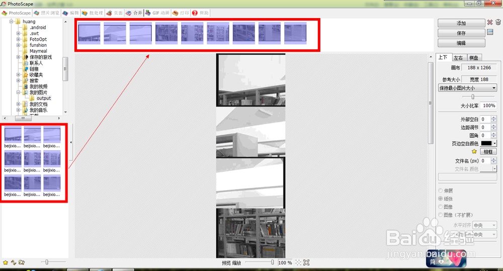 打開合并對話框,我們首先找到要合并的照片的存放位置,然后把照片拖動到photoscape中