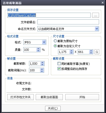 打開視頻之后找到要截取的畫面后,按Ctrl+G可以打開這個截圖的文件夾,頂上可以設(shè)置截取的圖片路徑,其他可以和我做一樣的設(shè)置,尺寸設(shè)置一欄可以選擇原始尺寸,但是如果截取很卡,可以改為自定義尺寸。需要字幕的話可以點上同時截取字幕。