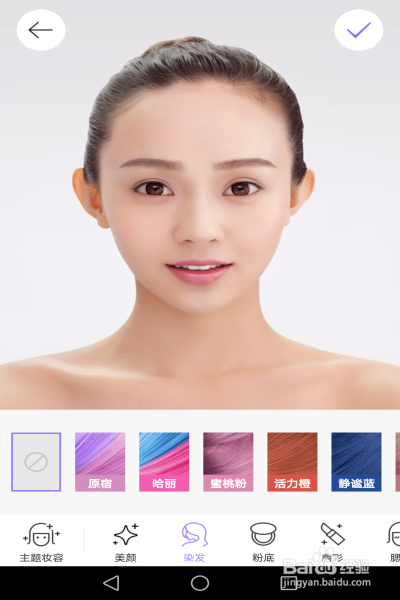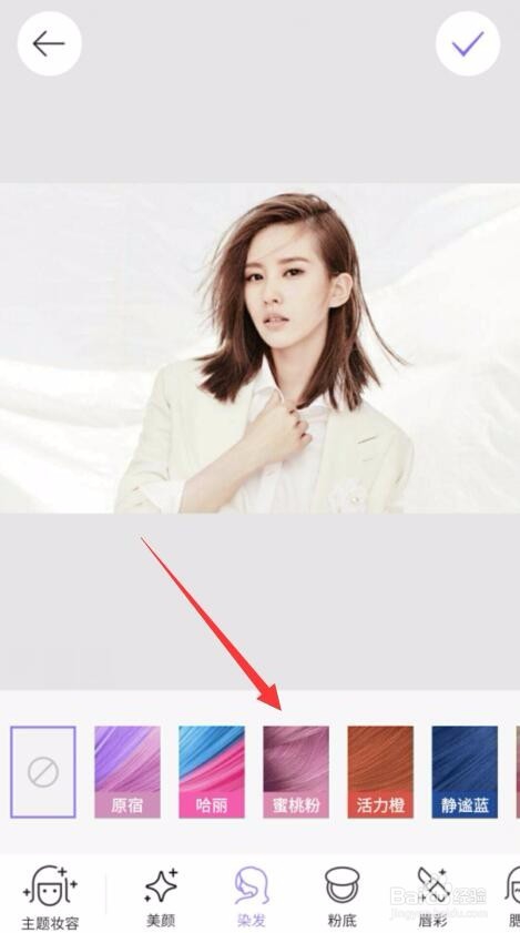 單擊之后會(huì)進(jìn)入到染發(fā)功能面板,在面板的底部會(huì)有好幾種頭發(fā)顏色供我們選擇。比如想試下“蜜桃粉”的話,那么就單擊“蜜桃粉”按鈕。