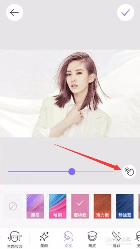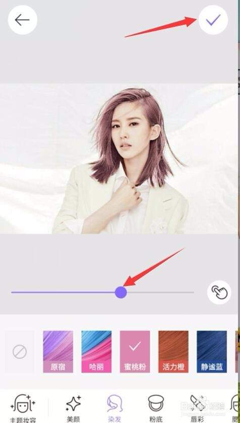 單擊之后會(huì)發(fā)現(xiàn)照片上的頭發(fā)顏色已經(jīng)自動(dòng)變成蜜桃粉了。如果覺得顏色ok的話,可以單擊右上角的“√”保存圖片。如果覺得顏色深淺度還要調(diào)整的話,可以拖動(dòng)下方的調(diào)整線來調(diào)整濃淡