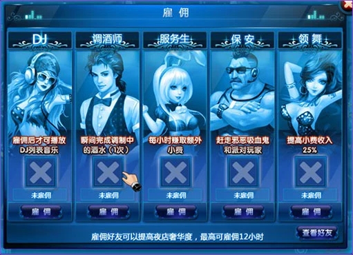 點擊游戲下方的雇傭圖標,可以雇傭好友為DJ、調(diào)酒師、服務業(yè)、保安、領舞來增加舒適度,好 友的等級越高越舒適度也就越多。每次雇傭使用時間為12小時,過期后需要重新雇傭。高等級的 玩家那都很搶手哦,所以下手必須準、快、狠。也可以通過合同雇傭,最長可雇傭48小時。