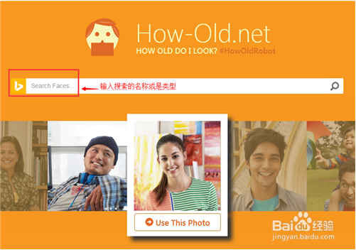 2、進(jìn)入首頁當(dāng)中,我們可以看到有一處搜索欄【Search Faces】,可以直接在此處輸入你喜歡的明星名字,可以搜索到他們的網(wǎng)上照片。這樣可以測試你喜歡的明星年齡。