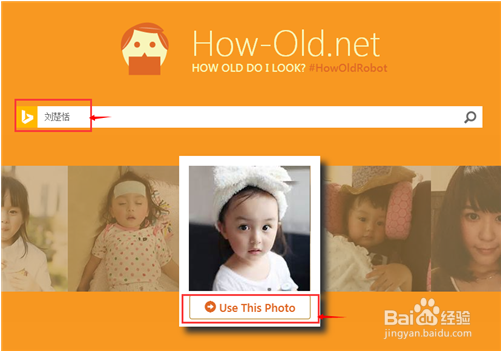 3、如下圖,我輸入這個(gè)小明星的名字,點(diǎn)擊搜索,下方會會搜索出她在網(wǎng)絡(luò)上的很多照片,選擇一張圖片,點(diǎn)擊圖片下方英文【use this photo】。