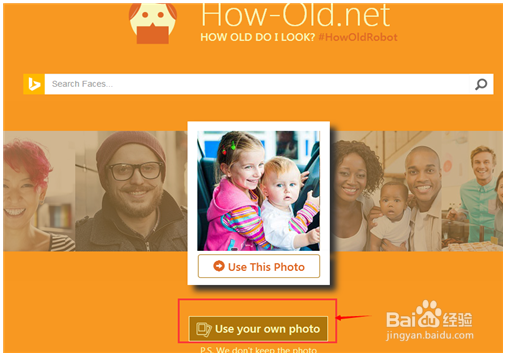 5、在how-old net上面,我們不僅可以測試名人明星的年齡,還可以測試自己或是親朋好友的,如下圖,點(diǎn)擊下方【use your own photo】,選擇自己的照片測試,看看自己又沒有變年齡了。