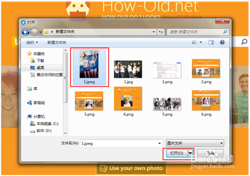 6、首先把自己或是朋友的美照保存在電腦上,通過上一步,從電腦上選擇一張自己的照片,點(diǎn)擊打開,即可馬上分析出有趣的結(jié)果。