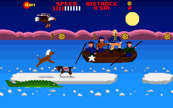 在這個(gè)完全不符合歷史真實(shí)故事的游戲中,喬治華盛頓在前往特拉華時(shí)發(fā)現(xiàn)他忘帶了他的假發(fā)。現(xiàn)在你將加入一群水手來(lái)尋找遺失的假發(fā)。游戲包含了經(jīng)典風(fēng)格的動(dòng)作場(chǎng)景以及可愛(ài)的小狗(除了那些長(zhǎng)得丑的)。包含