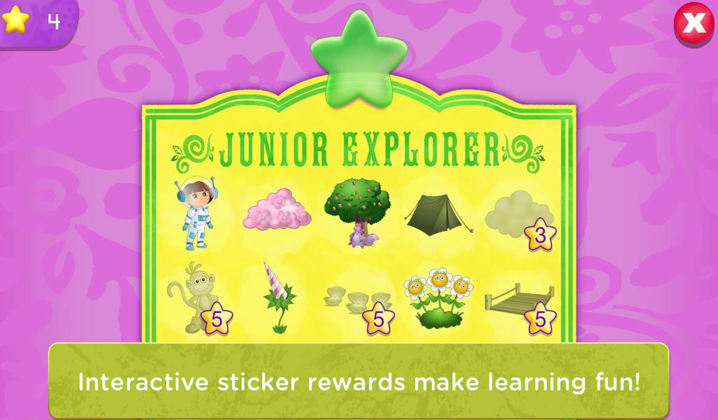 每天多拉將用自己的方式帶領(lǐng)您的孩子在冒險(xiǎn)互動(dòng)貼紙和徽章瀏覽器學(xué)習(xí)并給與獎(jiǎng)勵(lì)獎(jiǎng)勵(lì)!填滿背包從少年變成一個(gè)超級(jí)探索者!玩學(xué)習(xí)游戲,旨在促進(jìn)入學(xué)技能【軟件特點(diǎn)】