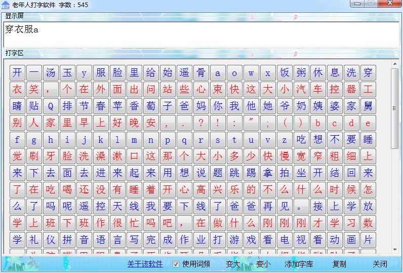 這是一款給一些識字但不懂得拼音五筆的老年人或者幼兒園的小孩打字的軟件.軟件的原理很簡單,只要讓兒女輸入一些常用的字到字庫,字庫中字會顯示在界面提供給老年人選擇,選擇組成一串句子后點復制,接著就可以把復制的句子粘貼到其他的地方.