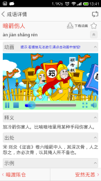 看動(dòng)畫(huà)學(xué)成語(yǔ):本成語(yǔ)詞典共收錄成語(yǔ)3萬(wàn)余條,數(shù)百個(gè)動(dòng)畫(huà)資源,寓教于樂(lè),邊看動(dòng)畫(huà)邊學(xué)習(xí),學(xué)習(xí)成語(yǔ)真輕松。【主要功能】