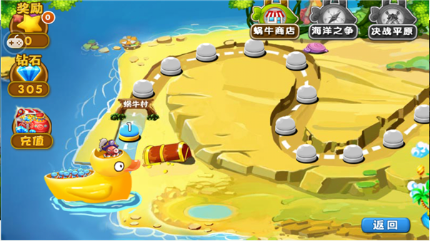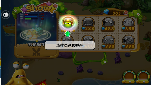 點擊游戲圖標(biāo),進入主界面點擊開始游戲,即可進入人氣爆棚的蝸牛戰(zhàn)爭。關(guān)卡界面左上方顯示為金幣和鉆石,這里玩家你可以通過塔防來升級角色能力,解鎖新塔防等等!