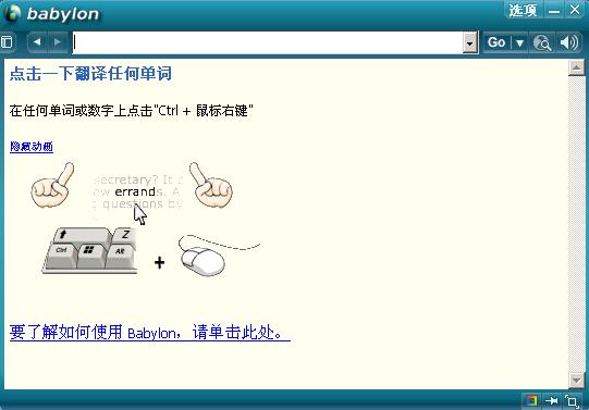 Babylon-Pro是有力的翻譯、信息和轉(zhuǎn)換工具, 可以立即提供有關(guān)您點(diǎn)擊的任何詞匯或數(shù)值的信息。只需輕輕一點(diǎn),英文單詞的解釋及其相關(guān)用法、信息就完全呈現(xiàn)在您的面前。除了翻譯功能外,Babylon還包括了貨幣轉(zhuǎn)換、時(shí)區(qū)轉(zhuǎn)換等功能。軟件使用方便,界面友好,是上網(wǎng)學(xué)外語(yǔ)的朋友們的首選工具。
