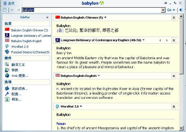 Babylon是一款來(lái)自以色列功能強(qiáng)大的詞典翻譯軟件,在全球已有超過(guò)70個(gè)國(guó)家2千2百萬(wàn)人使用。Babylon Pro 提供最專業(yè)英文翻譯,軟件具有多國(guó)語(yǔ)言翻譯功能,支持中文、日文、英文、德語(yǔ)等不同國(guó)家語(yǔ)言之間互相翻譯,只需輸入需要翻譯的詞語(yǔ),選擇翻譯的語(yǔ)言類型,系統(tǒng)就會(huì)自動(dòng)幫您轉(zhuǎn)換為相應(yīng)的語(yǔ)言翻譯,非常方便快捷,同時(shí)Babylon還具有在線同步翻譯功能,當(dāng)用戶的詞典具有多種語(yǔ)言類型時(shí),您在翻譯一種語(yǔ)言的時(shí)候,系統(tǒng)會(huì)自動(dòng)將所有的語(yǔ)言進(jìn)行翻譯,Babylon還包括了貨幣轉(zhuǎn)換、時(shí)區(qū)轉(zhuǎn)換等功能。Babylon和金山詞霸的最大的不同就在于babylon是基于互聯(lián)網(wǎng)上的應(yīng)用軟件,它充分的利用了互聯(lián)網(wǎng)的特性和資源,在網(wǎng)上不斷出現(xiàn)的新詞匯你都可以通過(guò)babylon找到適當(dāng)?shù)慕忉尅?br />