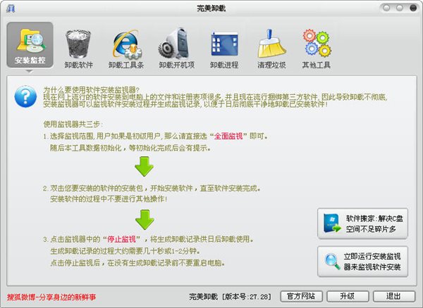 1、智能的安裝監(jiān)控:自動(dòng)監(jiān)控軟件安裝操作,為日后卸載作好記錄,在軟件捆綁盛行的今天尤為重要。2、全面的軟件卸載:軟件卸載的白金刀片,雙重卸載清理,更有手工卸載幫助用戶卸載任何軟件。