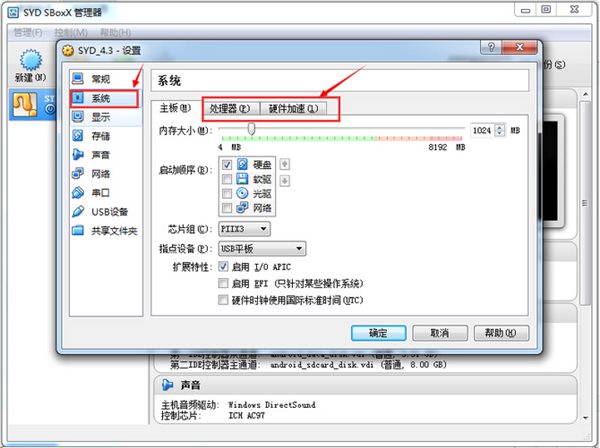 4、進(jìn)入設(shè)置界面后,先系統(tǒng)設(shè)置,在處理器選項(xiàng)的處理器數(shù)量拉到2,硬件加速選項(xiàng)內(nèi)打上勾。再確定保存。