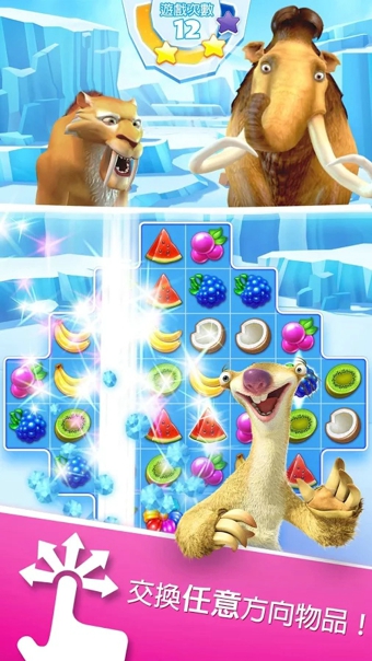 本作為一款讓玩家們《冰原歷險記》系列熟悉的三名主角~樹懶「喜德」(Sid)、長毛象「蠻尼」(Manny)與劍齒虎「狄亞哥」(Diego)等一起展開新冒險的動作益智游戲,游戲中采用讓玩家們將直線、橫線與斜線三個以上的相同水果湊齊在一起就能將之消去的三消型益智玩法,讓玩家們在三消益智過程中與喜德等夥伴一起來展開一場古代秘寶探索尋寶之旅!而且游戲中不但將會收錄各式各樣系列角色登場之外,還將會加入各種有趣的小游戲玩法讓玩家們來挑戰(zhàn),同時游戲內(nèi)也將會加入 PvP 的對人戰(zhàn)模式,讓玩家們可以與朋友來一較高下,一起享受本作的豐富游戲樂趣!