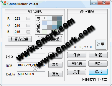 原來的ColorSnap,顏色捕獲工具,可以方便捕獲屏幕上喜歡的顏色,以多種格式顯示:RGB分量格式、網(wǎng)頁顏色格式、Delphi顏色格式,提供調(diào)色板對(duì)捕獲顏色進(jìn)行微調(diào),可以保存顏色信息以備以后使用,更能精確捕獲屏幕坐標(biāo)。增加工作狀態(tài)保存功能,重新打開可以恢復(fù)到上次關(guān)閉時(shí)的狀態(tài)。設(shè)置了16個(gè)歷史記錄槽,記錄吸取過的顏色