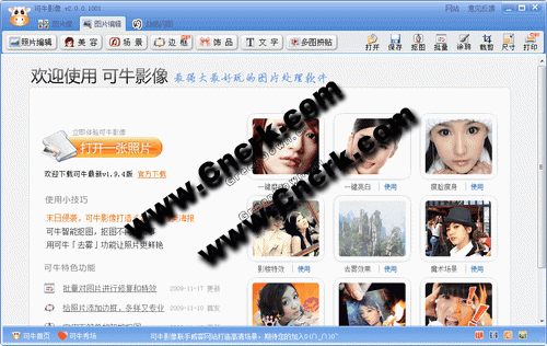 可牛影像是一款完全免費(fèi)、簡(jiǎn)單易用的圖片處理軟件,快速的圖片庫(kù)管理、強(qiáng)大照片美化處理、讓您輕松成為數(shù)碼照片處理專家。數(shù)千張精彩場(chǎng)景、非主流可愛飾品、影樓特效等等,告別繁瑣的PS,只需1分鐘即刻化身成影像明星