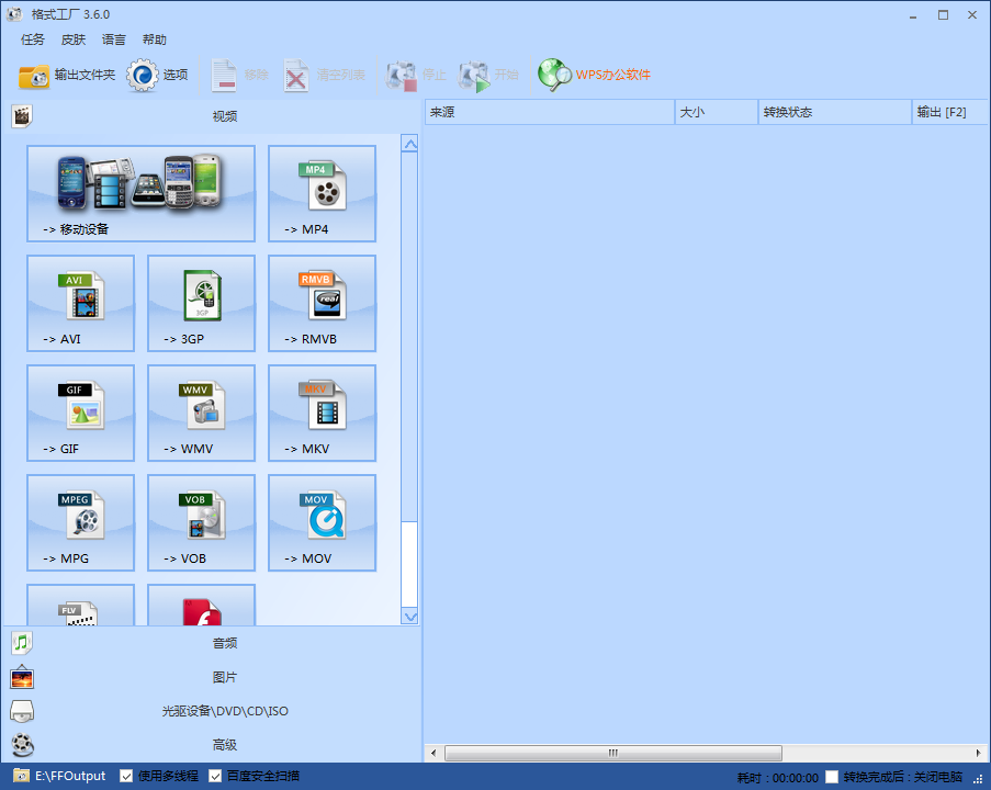 所有類型視頻轉到MP4、3GP、AVI、MKV、WMV、MPG、VOB、FLV、SWF、MOV,新版支持RMVB(rmvb需要安裝Realplayer或相關的譯碼器)、xv(迅雷獨有的文件格式)轉換成其他格式。所有類型音頻轉到MP3、WMA、FLAC、AAC、MMF、AMR、M4A、M4R、OGG、MP2、WAV