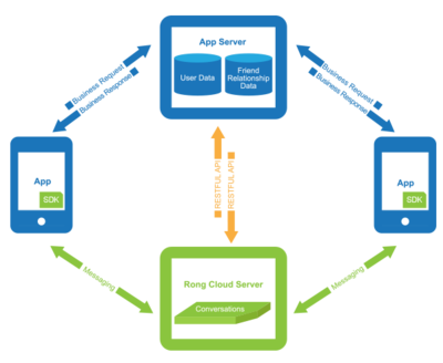 藍(lán)色箭頭表示您自己的業(yè)務(wù)數(shù)據(jù)經(jīng)由您自己的應(yīng)用服務(wù)器;綠色剪頭表示消息需要經(jīng)過(guò)融云服務(wù)器轉(zhuǎn)發(fā)(IM 的離線、通知等邏輯決定了消息必須經(jīng)由服務(wù)器進(jìn)行一次轉(zhuǎn)發(fā));橙色箭頭表示您的應(yīng)用服務(wù)器只需要和融云服務(wù)器進(jìn)行身份授權(quán),不需要您提交詳細(xì)用戶資料。