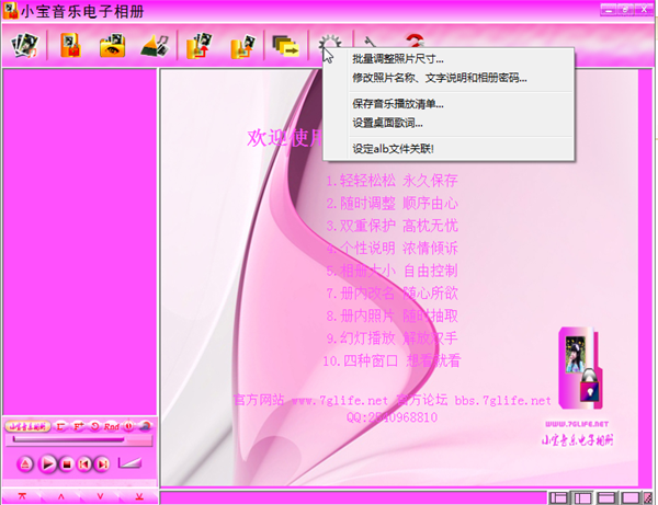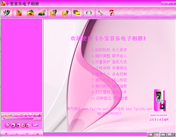 小寶音樂電子相冊是真正的三合一:電子相冊制作機(jī);桌面歌詞mp3 播放器;文件保險箱。寶寶電子相冊制作軟件在現(xiàn)在也是很多的朋友都是非常的喜歡使用的,想使用到這類型的軟件的朋友現(xiàn)在就可以來下載下面的這款不錯的小寶音樂加密電子相冊!支持“單曲循環(huán)、隨機(jī)播放、順序播放,一鍵導(dǎo)入上次播放清單”等音樂播放模式! 支持臨睡狀態(tài)設(shè)定(自動減低音量、預(yù)約關(guān)機(jī)),特別適合于開著電腦聽音樂忘記關(guān)機(jī)的童鞋。