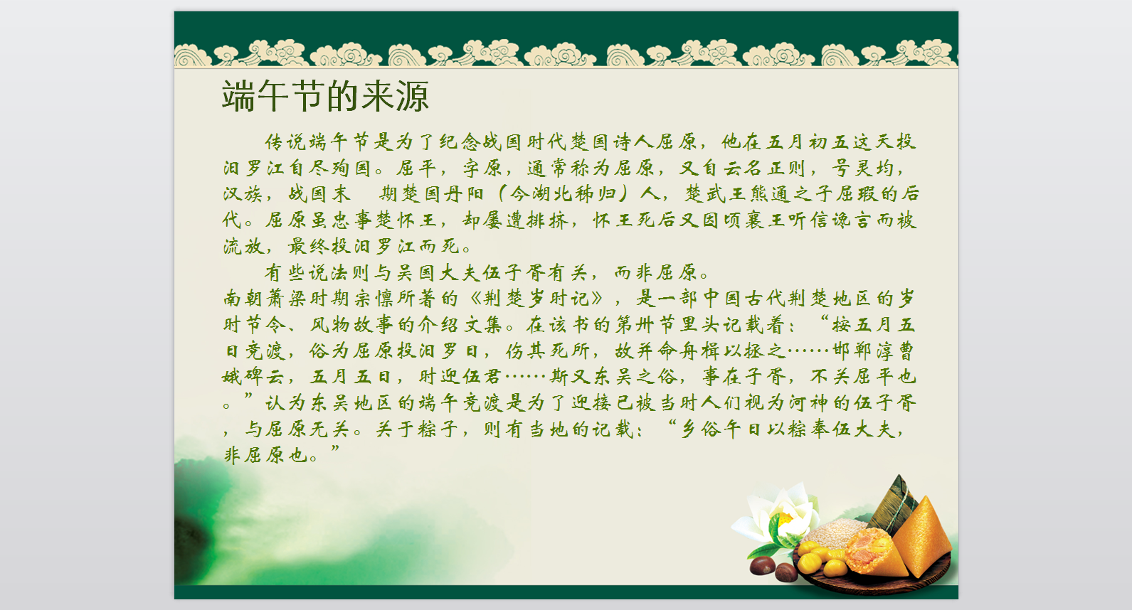 端午節(jié)的由來PPT模版 免費(fèi)版 這是一份介紹端午節(jié)由來的PPT模版,模版以粽子這個(gè)端午節(jié)的標(biāo)志物為背景圖片,突出主題。整篇PPT主要采用了文字?jǐn)⑹龅男问浇榻B了兩個(gè)不同的端午節(jié)的由來,并輔以圖片,使得整個(gè)模版更加生動(dòng)形象。此模版適用于各種介紹端午節(jié)的場(chǎng)合使用,喜歡的朋友可以下載下來哦。