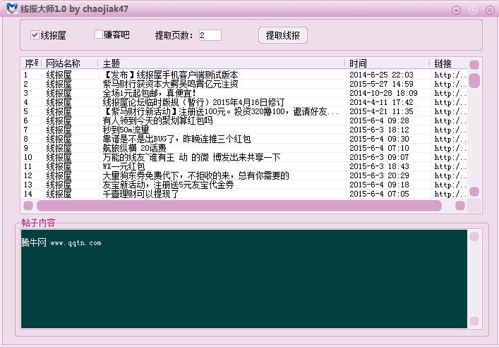 線報大師下載 1.0 官方綠色版 線報大師是一款免費綠色的帖子提取工具。該工具可以幫助用戶快速提取線報屋和賺客吧上的交易帖子,并且可以批量提取,方便又有效率,有需要的用戶可以下載使用看看。,為你快速領(lǐng)取各種禮包、紅包、話費以及各種活動優(yōu)惠券等等,精打細算,先人一步,是你的個人理財以及網(wǎng)賺的好幫手!歡迎免費下載這款線報大師!