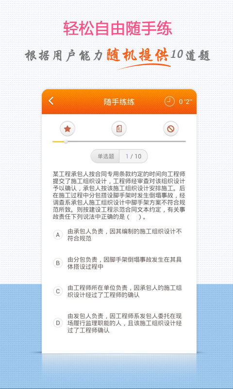根據(jù)所有用戶做題數(shù)據(jù),系統(tǒng)自動(dòng)計(jì)算題目難易程度,您適合做什么難度層次的題目,它了如指掌!有組織的抽出 10道題,供你練習(xí),指引你不斷提高!