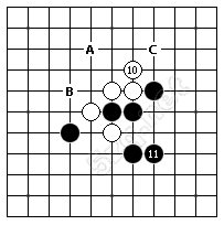 白10應(yīng)該走A或B點,這樣的行棋會更加積極,如此,黑棋就不能走11位攻擊了,而是要跟著白棋去防守。