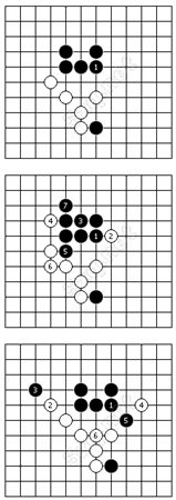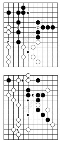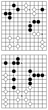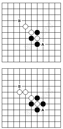 (圖3-1)中白活三,黑有A、B兩個防點來擋住白的活三。由此需要判斷哪個防點,更有利于自己的攻擊。很顯然,走在A點,自己會形成連接,而白棋并無后續(xù)手段,由此在黑防A后,需要回頭來防守黑棋,這樣白就失掉先手。這里,防在A點比B點更有利。(圖3-2)的情況則有不同,黑棋防在A點雖然對自己將來的進攻有利,但黑棋仍然必須防在B點,因為白棋在上面可以連續(xù)攻擊而獲勝。這里提示我們,要判斷哪個防點更有利,就必須考慮在防守以后,對手和自己的后續(xù)攻擊,而后才能選擇出正確的防點。