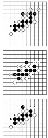 (圖11)中白棋試圖通過直接攻擊來連接左右。似乎黑走21后,再走A和B就能取勝了,但白棋在22形成反四,黑棋不得不防,之后白棋就可以在左邊擋住A、B的威脅。黑棋的攻擊失敗了。如(圖12),黑棋一招不成,又試圖從左邊開始攻擊,但是結(jié)果是一樣的,由于白棋的反四,黑棋攻擊又告失敗。(圖13),這個17是等著。此時,不論白棋防在哪里,黑棋都可以在A、B或C、D取勝。走了這手等著之后,白棋沒有任何反四的機會。這個圖剛好就能反映出等著的特點來,白棋無法形成先手,只能來防守,而由于黑棋不是直接攻擊,這樣白棋少了防守的子,從而無法形成反四。在走等著之前,一定要考慮對方的反擊。