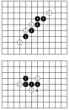 (圖17)是典型的斜線攻擊手段,在走出斜3、斜4后,黑9形成兩個活二,白棋無從防守。同樣的攻擊手段通常直線是不奏效的。如(圖18),黑5、7是直線的攻擊,黑7一子雙二,白棋在A點即可防住。