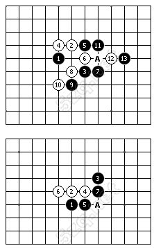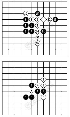 黑7后,黑棋形勢過強,白棋防守不住,所以必須另辟蹊徑,唯一的方法是利用黑棋的禁手。12的沖4是很好的時機,它形成了黑棋的禁手,并且下一步14就可以利用禁手取勝了。但對于無禁五子棋,則黑棋走7后就必勝了。這是一個錯誤利用禁手的例子。白8想抓禁手,卻是錯著,現(xiàn)在黑棋走在9就可以輕松取勝。很多剛接觸禁手的初學者,卻很興奮地以為能夠抓黑棋的禁手,忽略了黑棋有防抓禁的手段,而犯了這樣的錯誤。正確的走法是白8-A。