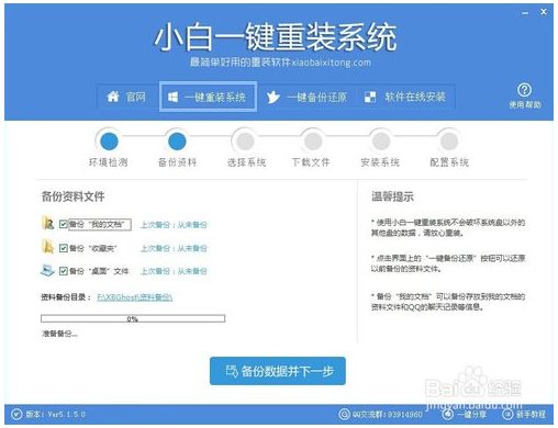 2、彈出提示對(duì)C盤“我的文檔”“收藏夾”“桌面”等文件進(jìn)行備份,可以自由選擇具體項(xiàng)目,備份的數(shù)據(jù)目錄在“XBGhost/資料備份”,盤符則是小白自動(dòng)判斷電腦上最大剩余空間的磁盤。完成后點(diǎn)擊下一步