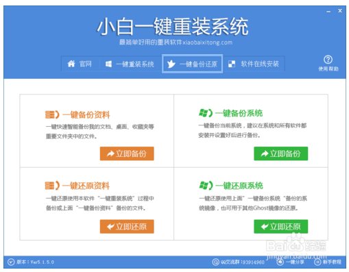 6、另外一個(gè)功能就是小白的一鍵備份還原功能,包括數(shù)據(jù)的備份還原和系統(tǒng)的備份還原兩個(gè)功能共4個(gè)選項(xiàng),根據(jù)自己的需求使用即可。