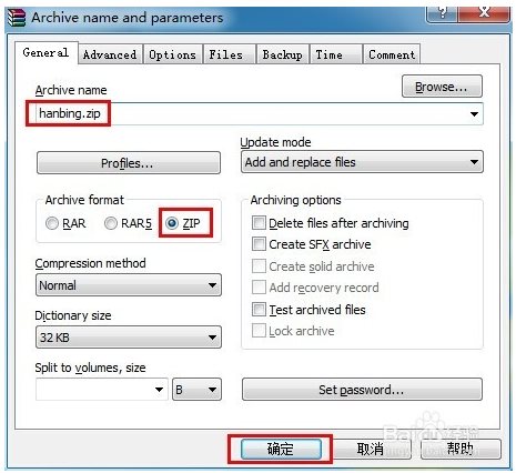 6、在彈出的“添加到壓縮文件”窗口中,輸入壓縮文件名稱“hanbing",并將其壓縮格式設置為“Zip”,點擊“確定”按鈕。如圖: