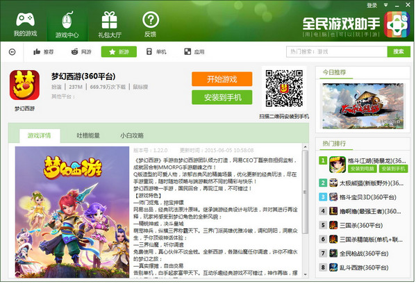 全民助手是新一代可以用電腦玩手游的安卓模擬器,具有游戲多開,全線普遍兼容,超低資源占用,極速安裝運行,綠色輔 助腳本等特點,兼容目前所有windows平臺,且可完美適配99%安卓游戲,并對市場上的火熱游戲進行了深度優(yōu)化,如部落沖突 ,夢幻西游,天天酷跑、火影忍者,穿越火線等,實現(xiàn)了超越手機運行的流暢度和畫面效果,更有深度定制的輔助工具,玩游 戲更加省心!全民助手秉承三種核心體驗(簡稱“三體”)宗旨,無閃退,無黑屏、無卡頓,堅持用戶為中心的產(chǎn)品理念,是目前所有同類產(chǎn)品中功能最完善,體驗最好的安卓模擬器!