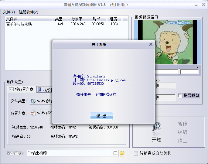 3、再打開“海潤萬能視頻轉(zhuǎn)換器V1.3.exe”文件,運行軟件。會顯示已注冊用戶。