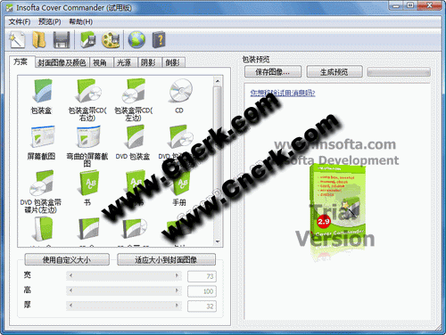 Insofta Cover Commander 讓你可以制作看起來(lái)非常專業(yè)的、適合于網(wǎng)絡(luò)發(fā)布或者打印的模擬產(chǎn)品包裝和應(yīng)用軟件截圖。該軟件提供了若干個(gè)用于創(chuàng)建帶有或者不帶有光盤(pán)的模擬光盤(pán)和帶有可選擇的陰影和倒影效果的既可以是整齊的也可以是彎曲的三維立體風(fēng)格截圖的設(shè)計(jì)模板。所有需要你做的就是載入用于前、后和側(cè)封面的圖像,或者一個(gè)規(guī)范的應(yīng)用軟件窗口的截圖,然后該軟件將應(yīng)用選擇的風(fēng)格,并且允許你通過(guò)調(diào)整鏡頭角度、陰影、倒影和燈光設(shè)置來(lái)進(jìn)一步定制你的設(shè)計(jì)。可以采用三維立體模式預(yù)覽,并且可以被自由地旋轉(zhuǎn)以達(dá)到想要的效果。最終設(shè)計(jì)可以被呈現(xiàn)為各種不同的尺寸并且可以保存為 PNG、GIF、JPG 或者 BMP 圖像格式。設(shè)計(jì)成果震撼人心!相對(duì)2.0版豐富了模板