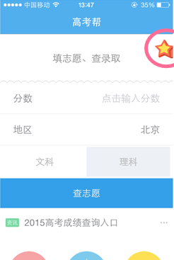 高考幫怎么查看高考錄取分?jǐn)?shù)線?1、打開【高考幫】,進(jìn)入首頁后點(diǎn)擊右上角的【星星】按鈕。(如下圖)