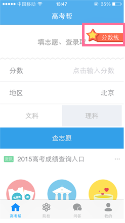 2、彈出后點(diǎn)擊【分?jǐn)?shù)線】,即可跳轉(zhuǎn)到2015年各省各批次的控制分?jǐn)?shù)線列表啦。(如下圖)