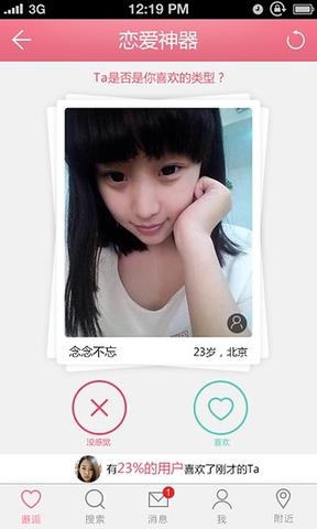 “戀愛神器”是新一代的婚戀交友軟件,依托1億1億9836萬用戶的專業(yè)平臺(tái),創(chuàng)新式的交友方式:簡(jiǎn)單、快捷、靠譜;隨時(shí)隨地聽妹子在線告白。【精準(zhǔn)推薦】:根據(jù)您的條件,推薦與你最匹配的優(yōu)質(zhì)異性!