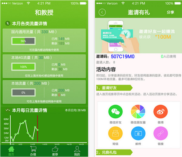 1、分享活動(dòng)盛大開(kāi)啟,你只要分享給身邊的上海移動(dòng)好友,好友通過(guò)邀請(qǐng)碼登陸后雙方即可獲得100M本地流量,可多次分享,流量不夠的小伙伴趕緊行動(dòng)吧。2、流量查詢(xún)更加簡(jiǎn)單,只顯示通用流量和本地流量,讓你不再迷茫。