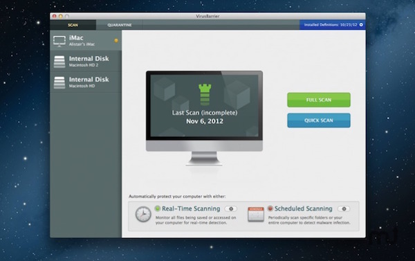 要掃描具有相應(yīng)權(quán)限的所有文件,請(qǐng)單擊 VirusBarrier Express 或 VirusBarrier Plus 球體下的全面掃描按鈕。 這樣便可掃描個(gè)人文件夾中的所有文件,以及可以讀取的其他文件。(如果使用的是標(biāo)準(zhǔn)管理員帳戶,單擊“全面掃描”按鈕后還將掃描“應(yīng)用程序”文件夾中的所有應(yīng)用程序,以及“資源庫(kù)”和“系統(tǒng)”文件夾中的大部分系統(tǒng)文件。)