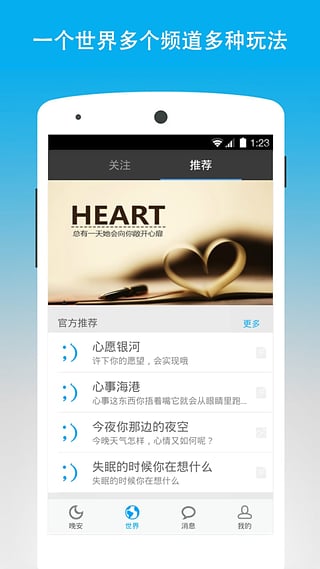 晚安、晚安世界、晚安地球人、晚安心語、晚安寶貝、晚安催眠曲、睡前故事、音樂故事和心事港灣、睡前活動、晚安電臺、晚安日語、晚安語錄、晚安短信、晚安英文、晚安圖片、晚上去哪兒、鄧紫棋晚安、林宥嘉晚安、goodn ight,一切盡在晚安世界,歡迎下載體驗。相關應用:我要早睡、睡覺鬧鐘、健康鬧鐘、正點鬧鐘、最美鬧鐘、醒醒、誰叫我起床、誰叫你起床、時間表、晚安吻、微信、陌陌、蘑菇街、美美麗說、貼吧、same、gege、平行世界、社交鬧鐘