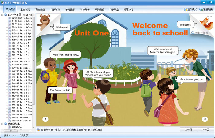 PEP小學(xué)英語點(diǎn)讀機(jī)(三年級下冊)根據(jù)人民教育出版社2012年最新出版的課本配套開發(fā)完成,是一款專門針對PEP小學(xué)英語的輔助學(xué)習(xí)軟件,該軟件與教材完全同步,有清晰的圖片和英語讀音,主要提供點(diǎn)讀功能和動畫互動模塊,讓小學(xué)生不僅能看到全彩的課本畫面,而且能點(diǎn)哪里哪里發(fā)音,可以有效激發(fā)學(xué)習(xí)興趣,提高英語聽說能力,為孩子將來的英語學(xué)習(xí)打下良好的基礎(chǔ)。