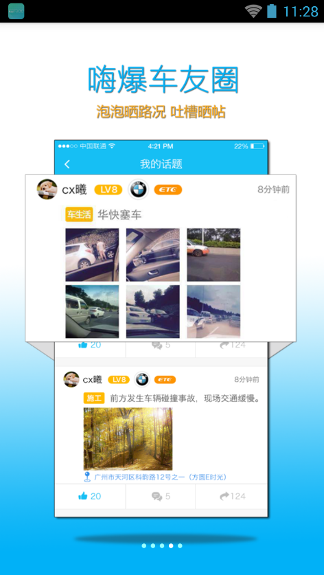 3、依托強(qiáng)大的高速公路路況信息及車友實(shí)時分享的路況數(shù)據(jù),通過路況地圖及車主分享互助的方式結(jié)交車友,打造屬于自己的汽車生活圈。