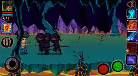 - 界面左上方顯示為角色血量和真氣值,點(diǎn)擊界面右方的按鈕控制角色技能、道具使用!