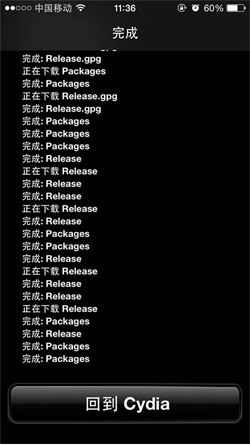 13. 開(kāi)始添加源的數(shù)據(jù)包,下載完點(diǎn)擊“回到cydia”
